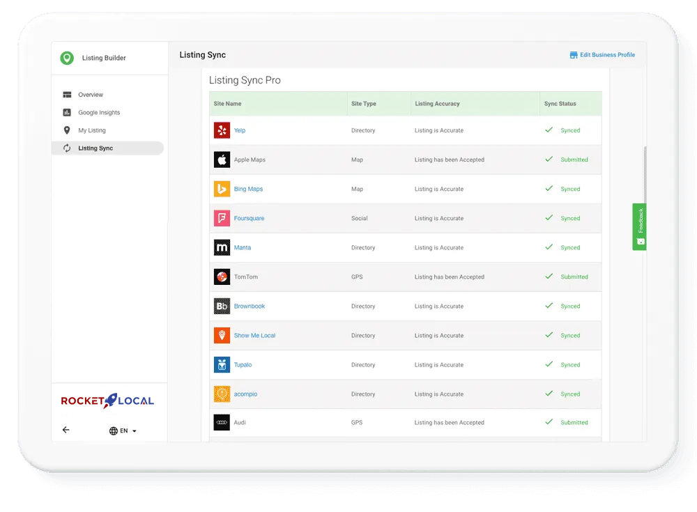 Google is the most important place for businesses to be listed. With Google My Business Profile, local businesses, brands and organizations can effectively manage their presence on Google Search and Maps. Rocket Local has integrated with Google Business Profile to enable local businesses to update their location data instantly from one easy-to-use dashboard.